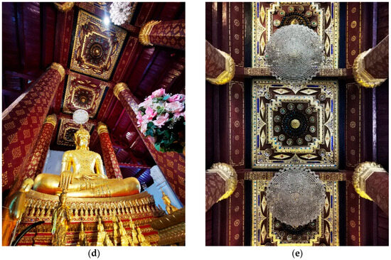 Na Phra Meru Historical Temple architecture: (a) landscape of main ordination hall, (b) main Buddha image in ordination hall, (c) inside main ordination hall, (d) top roof, and (e) carved wooden beams and ceiling adorned with wood carvings showing stars and the moon, (Photo 10 Jan 2024 by Mongkol Kaewbumrung).