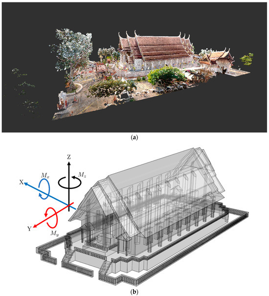 Thailand’s heritage sites are governed by national legal protocols and UNESCO guidelines, requiring strict adherence to minimize potential damage during research activities. Although the Na Phra Meru Historical Temple is not officially listed as a part of the UNESCO Heritage area, its proximity to a recognized heritage area necessitates compliance with UNESCO protocols to ensure its preservation and proper care. We utilized FARO focus laser scanning technology, Focus3D with 250,000 points/s, and a measurement tolerance of within ±2 mm. The scanning procedure scanned outside and inside the main ordination hall without affecting the heritage building [24,25] and took 4 days to complete. The 3D surface and solid volume were produced using the ANSYS SpaceClain and ANSYS Design Modeler version 2024R1, as shown in Figure 4. To overcome the limitation of very complex traditional ancient Thai architecture, we cut out the more elaborate details for simplification. However, the principal dimensions and details were retained.