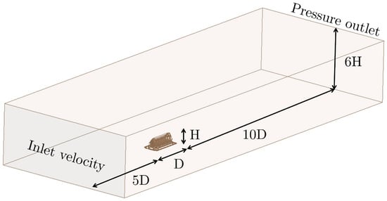 The accuracy of CFD simulations is influenced not only by grid resolution and numerical settings but also critically by the initial and boundary conditions. This study established boundary conditions based on measurements taken within the main ordination hall to ensure a realistic representation of the physical environment. Figure 6 provides details on the sizing of the computational domain, designed following standard guidelines and recommendations [26,27,28,29]. The domain was set with an upstream length of 5D to account for the incoming flow, a downstream length of 10D to allow for full wake development, and a height of 6H for adequate vertical resolution. However, these dimensions were slightly adjusted based on the availability of computational resources or to address solution instability during simulations. This practical approach enhanced the reliability and applicability of the simulation results.