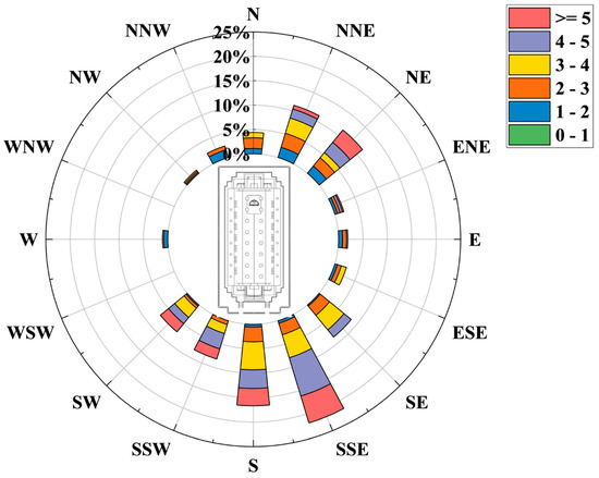 To meet the requirements for assessing the environmental impact of airflow inside the main ordination hall, we analyzed wind direction data obtained from the Thai Meteorological Department, specifically focusing on wind rose data from Ayutthaya province (Figure 7). The analysis revealed that throughout the year, the wind predominantly flowed from specific directions, which allowed us to identify representative cases. Based on this information, we selected the top-five wind directions for our investigation: south (S = 180°), south-southeast (SSE = 157.5°), east (E = 90°), northeast (NE = 45°), and north (N = 0°). These directions represented the primary wind patterns affecting the region and ensured a comprehensive understanding of the airflow dynamics in the Temple. To simplify the simulation and focus on the primary objectives, we assumed a constant wind velocity for all cases, based on measured values from our experimental setup. This approach ensured uniform boundary conditions and facilitated the comparison of flow behavior under similar conditions. Additionally, the atmospheric boundary layer was neglected in the simulation, as the Temple’s geometry and airflow within the enclosed hall were the primary factors influencing internal ventilation and including the atmospheric boundary layer would have added complexity without substantially impacting the localized airflow patterns within the Temple that were the focus of this study. These assumptions and selections provided a streamlined yet reliable framework for investigating the environmental impact of flow behavior inside the ordination hall, while maintaining alignment with real-world wind conditions in Ayutthaya province.