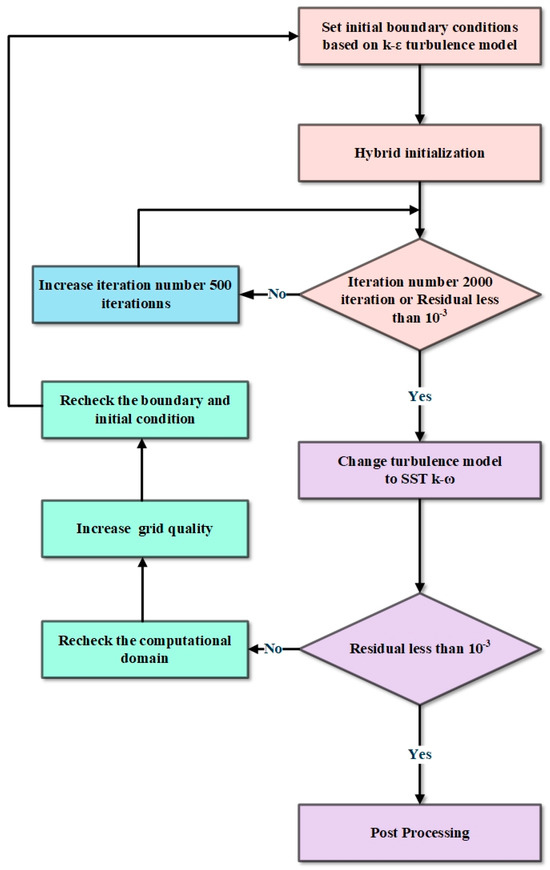 The solution initialization process began with applying the standard k-ε (STD) turbulence model using first-order numerical discretization. As discussed in the previous section, turbulence boundary conditions were applied to establish the initial simulation environment. The first simulation was run for 2000 iterations or until the solution residuals converged to less than 10−3. Following this initial phase, the turbulence model was switched to the SST model, utilizing second-order numerical discretization to ensure higher accuracy. This transition ensured that the solutions maintained consistency and achieved the desired level of accuracy for detailed analysis. The complete solution initialization workflow is illustrated in Figure 8, while Table 2 summarizes the grid number and Table 3 summarizes the numerical settings applied during each simulation stage.