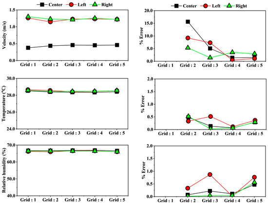 The simulations were conducted using the time-averaged technique with the SST turbulence model to analyze the flow field. Five grid configurations were tested to evaluate the impact of grid size on the simulation results, as illustrated in Figure 9. The grid independence test was conducted using averages of three key parameters (velocity, temperature, and humidity) to ensure that the simulation results were not dependent on grid resolution. As shown in Figure 5, the center, left, and right lines were divided into 200 points to accurately measure the flow characteristics. A systematic grid independence study was performed to minimize errors caused by grid variation. Based on this analysis, Grid Case 4 was selected for all subsequent simulations, as it had less than 5% variation compared to finer grids. This selection guaranteed a balance between computational efficiency and solution accuracy, ensuring reliable final results.