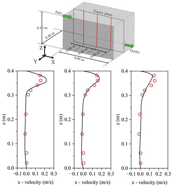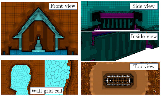 In this study, the turbulence model, boundary conditions, and grid type were carefully selected and validated using the methodology proposed by Chen et al. [28], which served as a benchmark for the academic test case. As shown in Figure 11, the chosen numerical settings accurately replicated the expected physical behavior of airflow dynamics. This validation ensured that the selected turbulence model and boundary conditions were suitable for the specific conditions of the Na Phra Meru Historical Temple, confirming the reliability of the CFD approach for studying complex airflow and ventilation within heritage structures. These findings provided a solid foundation for applying advanced CFD techniques in heritage conservation, ensuring the robustness and accuracy of the simulation setup.