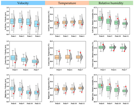 For the onsite experiment, 11 measurement points were selected, as shown in Figure 5, to record velocity, humidity, and temperature, ensuring consistency in flow characteristics. The results are presented in Figure 12 that compares the measurement data with the CFD simulation results over a 3 h period on 9 August 2024, from 8:00 to 11:00 AM, with data collected at 15 min intervals. The comparison revealed a strong agreement between the CFD predictions and experimental measurements, confirming the accuracy and reliability of the simulation model, making it well-suited for the next phase of parameter variation studies.