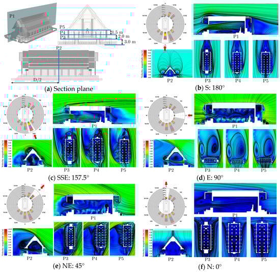 Five primary airflow directions were selected based on meteorological data to simplify the complexity of the case study, ensuring comprehensive and practical evaluation outcomes for preventive conservation and visitor comfort. The results are presented in Figure 13 and revealed complex velocity distributions and distinct recirculation zones across five sectional planes inside and outside the building. All examined cases involved considerable complexity due to multiple recirculation zones, particularly when the airflow direction was not aligned with the main entrance. Figure 13b illustrates the scenario in which the incoming airflow direction was perpendicular to the main entrance of the building, demonstrating the formation of a large recirculation zone in the lower part of the structure. Notably, as the angle of incoming airflow direction increased, the airflow patterns within the building became increasingly more complex. This complexity was characterized by the emergence of multiple recirculation zones, as clearly depicted in Figure 13c–e. Such findings underscored the influence of airflow direction on the internal ventilation dynamics, highlighting the necessity for careful consideration of airflow orientation in heritage conservation strategies.