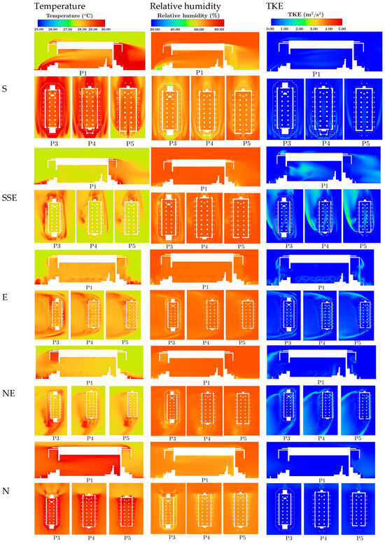 Figure 19 presents the correlation coefficients for key airflow properties—air velocity, temperature, relative humidity (RH), and TKE—for five different wind directions (S, SSE, E, NE, and N). The main results from the numerical simulation were: