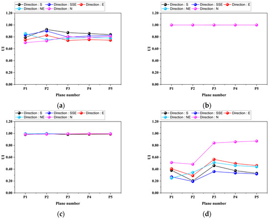 We analyzed five primary wind directions in order to understand how local turbulence in the wind direction affects airflow behavior inside the main ordination hall, as shown in Figure 7. We used the UI to measure how evenly the airflow was distributed within enclosed spaces [34]. High UI values indicate consistent airflow which helps to maintain stable temperature and humidity levels. A stable airflow prevents moisture accumulation and avoids excessively dry conditions. Both excessive moisture and overly dry environments can cause material deterioration. In contrast, low UI values suggest uneven airflow creating stagnation areas that lead to moisture buildup or dryness issues [35]. Moisture buildup can cause structural damage, mold growth, and poor indoor air quality that negatively impact the health of occupants [36]. Similarly, overly dry conditions can lead to cracking and weakening of historical materials. Therefore, ensuring uniform airflow distribution is essential for preserving historical buildings and maintaining suitable indoor conditions for long-term conservation [37]. Figure 16 illustrates the UI distribution on the section plane, demonstrating the variation in airflow uniformity.
