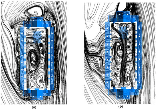 The flow patterns focusing on the observation plane under different wind conditions are illustrated in Figure 18, highlighting how airflow interacts with slit windows located at various positions around the building. The results demonstrated that slit windows play a major role in shaping indoor airflow behavior. They generate localized internal recirculation zones and contribute to air exchange between the inside and outside of the structure. notably, the results in Figure 18c also highlight a previously unnoticed protective function of the slit windows. The airflow exiting from the interior through these openings forms a distinct outward air layer that acts as a buffer. This layer separates the interior environment from the large external recirculation zones generated by wind flowing around the building. Rather than mixing, the outward airflow from the slit windows prevents the external recirculation air from entering the building, effectively shielding the interior. This self-protective mechanism emphasizes the importance of slit windows not only as ventilation features but also as passive barriers that help maintain indoor environmental stability. These insights should be very useful for informing conservation strategies to enhance the long-term protection of historical architecture.