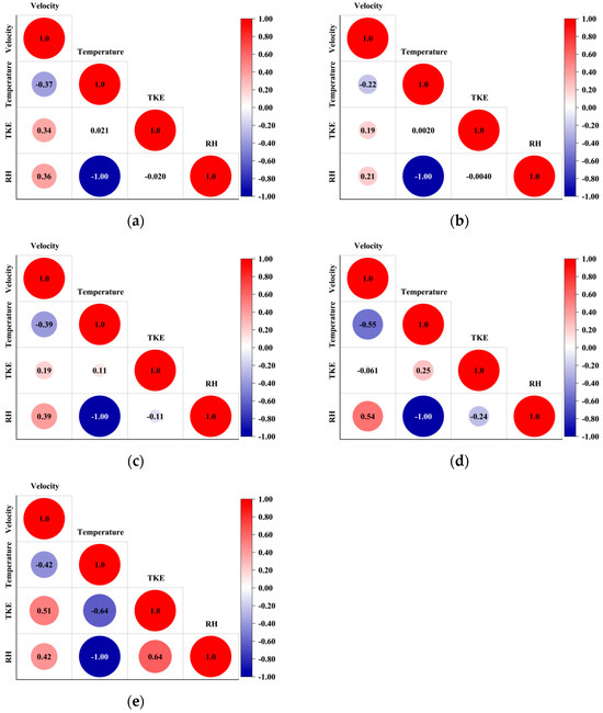 The previous section examined airflow structure and behavior through flow visualizations. This section uses statistical correlation analysis to explore the quantitative relationships between key flow properties, consisting of temperature, air velocity, relative humidity, and TKE. Understanding how these variables are interrelated is essential for identifying the underlying patterns that govern indoor environmental conditions. By examining these correlations, we aimed to determine which parameters most strongly influenced others and how they collectively contributed to airflow behavior within the building. Reference classifications widely used in engineering and ventilation studies are provided in Table 4 to interpret the strength of the correlations [38]. This approach should support more informed decision-making for climate control and conservation planning in heritage buildings.