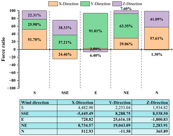 Understanding the aerodynamic forces acting on historical structures is essential for evaluating the long-term impact of wind on building stability. Unlike modern buildings, heritage structures often lack built-in wind resistance, making them vulnerable to directional wind forces that may cause cumulative stress, cracking, material fatigue, or sudden failure. Therefore, analyzing the distribution and magnitude of wind-induced forces across different directions is vital to identifying areas at higher risk and developing informed conservation strategies. This section presents the results of aerodynamic force analysis under five main wind directions: S, SSE, E, NE, and N. These directions are consistent with Figure 4b. The forces were calculated on the wall of the Temple in three directions: X (across the width), Y (along the length), and Z (vertically). The bar chart in Figure 20 shows the relative distribution of aerodynamic forces acting on the building in these three directions. The results revealed that winds from the South (S) and North (N) strongly impacted the X-direction, contributing approximately 51.70% and 57.61% of the total force, respectively. This suggested there was considerable lateral pressure on the side walls of the building. In the Y-direction, the E wind produced the highest force ratio (91.01%), followed by the NE (63.35%), indicating strong drag forces acting along the length of the structure, which may affect long masonry walls or wooden beams. In the Z-direction, representing vertical pressure or uplift, the major contributions were from the SSE and N winds (38.33% and 41.09%, respectively). These forces should be of concern regarding potential uplift on the roof or weakening of upper wall sections. Considering the actual force values, the SSE direction had a large negative force in the X-direction (−5449.49 N), suggesting possible suction or reverse airflow near the side walls. In the Y-direction, the E wind produced the strongest force (25,616.18 N), aligning with the high ratio shown in the graph. In the Z-direction, the vertical force was the highest for SSE winds (8538.50 N), followed by NE winds (2283.91 N). These values should be of concern regarding the safety of roof elements and structural joints.