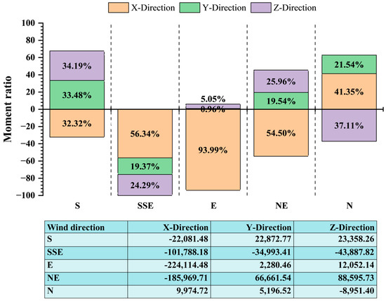 The moment ratio graph in Figure 21 presents the percentage contribution of aerodynamic moments in three directions. The X direction, which represents horizontal rotation across the width of the building, had the highest moment ratio from the E wind (93.99%), followed by the SSE wind (56.34%) and the NE (54.50%). These results indicated that wind from these directions caused strong lateral rotational forces, which might place stress on side walls and column connections. In the Y direction, which corresponds to twisting along the length of the building, the highest moment ratios were from the S wind (33.48%) and the N wind (21.54%). These forces could introduce torque along long walls, leading to misalignment or fatigue in structural elements such as beams or load-bearing walls. The Z direction, which represents vertical torsion or uplift, was most influenced by the N wind (37.11%) and the S wind (34.19%), followed by the NE wind (25.96%). These vertical moments could cause deformation or displacement of the roof, particularly in buildings using traditional wooden frames or clay tiles.