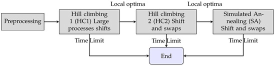 The idea here is first to preprocess the instance data to discard infeasible assignments and then search using fast search approaches to obtain high-quality solutions in reduced execution times. If search approaches become stuck on local optima, the next step is executed. HC1 and HC2 use different movements in order to satisfy the most complex constraints first, then the algorithm used, HC or SA, depends only on the local optima HC finds during its search in the different cases being solved. Eventually, when the large processes shifts move does not become trapped in local optima, final solutions can be obtained only using this step of the algorithm. If during HC1 the algorithm becomes stuck and still has available execution time, it can perform HC2 to continue searching on different neighborhoods. If the algorithm becomes stuck using HC2 and still has available time, it can use the SA strategy that allows escaping from local optima.