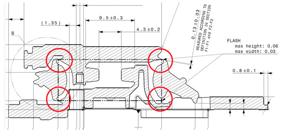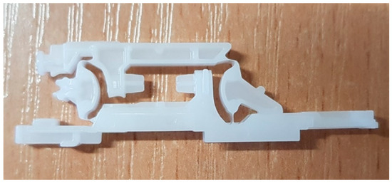 The main element of the valve, apart from the control plate, is the actuator, shown in Figure 1. Its task in the valve is to open and close the air channel, by means of which the position of individual seat elements is changed. The key parameter subject to control is the thickness of the hinges. They are marked with a red circle in Figure 2. This thickness determines the durability of the hinge throughout the product life cycle. The actuator is made of polyoxymethylene, and in thin places, such as the hinge, there are overhangs and flashes; the specification for this hinge is 0.13 ± 0.03 mm.