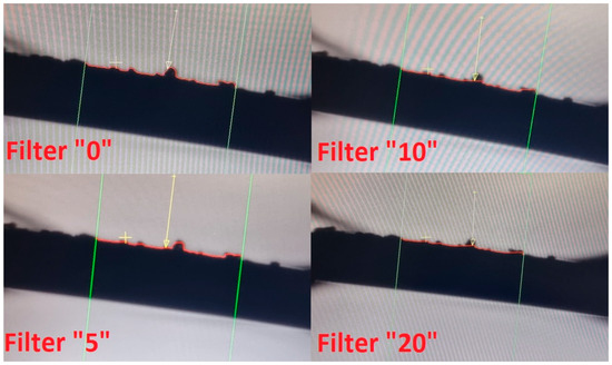 The use of filtration with a value higher than “0” has an impact on the obtained results. In the conducted studies, it turned out that the use of filtration at the level of “5” or “10” allowed us to obtain results close to the real ones. In such a case, cutting off noise is a cosmetic procedure, because it does not interfere with the depth of the material but only corrects the measured edge. The use of filter values of “20” or more causes distortion of the real dimensions and thus negatively affects the adjustments and settings of machines in the process.