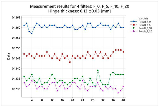 For each filter, 40 measurements of the hinge thickness were taken. For each filter used, a statistical analysis was performed in the Minitab 22.1 (64-bit) environment. The initial statistical analysis of the data included determining the basic statistical parameters presented in Table 1, as well as an analysis of variance planned later to verify the hypothesis of equality of variances for each of the analyzed factors, which were the filters used. A graph was developed from the data, presenting the results for all four analyzed filters.