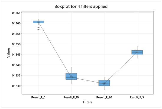 The graph in Figure 6 shows the differences between the individual filters, which confirms that filtration affects the measurement results. By increasing the filter value, we obtain lower values from the measurements. Figure 7 leads to the same conclusion. This graph is a commonly known graph called a box with whiskers. It presents a comparison of data obtained from measurements for the filters used. From this graph, we can obtain information about the location and dispersion of the data. For the first box, i.e., for the zero filter, we observe values that are outliers from the rest, which are not visible for the remaining boxes corresponding to filters 10, 20, and 5. In addition, we can see that the median for filters 0 and 5 is in the middle position, while for filters 10 and 20, the median is shifted towards the first quartile.