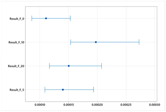 The initial statistical analysis included the identification of outliers. Basic descriptive parameters were determined, as shown in Table 1. The statistical analysis is presented in Figure 7. Using the multiple comparison test and Bartlett’s test [17,18] for parameters subject to a normal distribution, a statistically significant difference was found at the significance level of α = 0.05 between the variances at the analyzed levels of the studied factor: multiple comparison test—p-posttest = 0.004, Bartlett’s test—p-posttest = 0.004 (Figure 8).