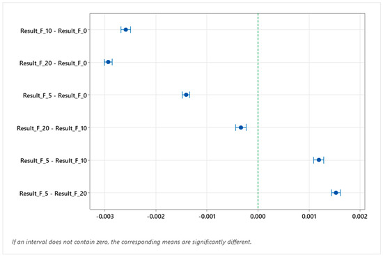 In view of the rejection of the hypothesis of equality of mean values at the analyzed filtering levels, the Games–Howell multiple comparison test (post hoc test) was performed to identify the significance of differences between the means for each pair of filtering levels. At the significance level of α = 0.05, there was a statistically significant difference between each pair of filtering levels (Figure 10).