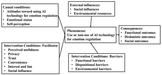 Axial coding was employed to explore the relationships between these categories, constructing a preliminary conceptual framework illustrated in Figure 1. This framework is structured around five key components: causal conditions, external influences, phenomena, intervening conditions and consequences [65]. The figure illustrates the results of axial coding. The key focus of this study suggests that the central action of “use or non-use of AI technology for emotion regulation” is related to other categories and subcategories embedded in causal conditions, external influences, phenomena, intervention conditions and consequences.