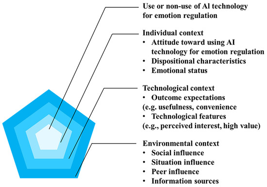 In the final stage (selective coding), all categories and themes were revisited and synthesised to construct a four-layer theoretical framework based on the qualitative data (Figure 2). The model identifies three primary contextual influences on choice behaviours: personal, technological and environmental. The core or innermost layer of the underlying model is the “use or not-use of AI technology for emotion regulation”. Each surrounding layer exerts a direct or indirect influence on this central behaviour through its constructs or by interacting with adjacent layers.