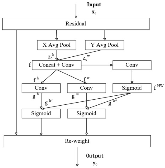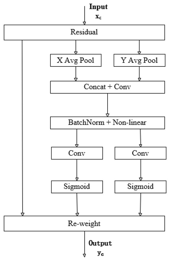 In the realm of deep learning, traditional attention mechanisms—such as self-attention—have produced remarkable results in capturing dependencies within sequences or images. However, they often overlook the significance of location information. To address this shortcoming, Hou [28] introduced coordinate attention, which further enhances the channel attention mechanism by decomposing it into two independent one-dimensional feature encoding processes for feature aggregation along the spatial dimensions (height and width). Leveraging the spatial dimensions enables the model to capture long-range dependencies in one spatial direction while preserving the precision of positional information in the other. The coordinate attention structure is illustrated in Figure 3.