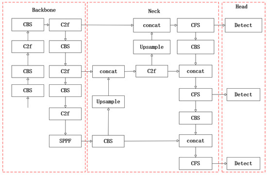 Although YOLOv8 models exhibit outstanding comprehensive performance within the YOLOv8 series, there is still potential for further improvement. In this study, we replace Bottleneck with the FasterNet Block within the C2f framework to reduce the model’s overall parameter count and computational complexity. We introduce the self-weight coordinate attention mechanism and propose C2f-Faster-SWCA (CFS), aiming to minimize computational overhead while maintaining model performance.The network architecture of Yolo-CFS is shown in Figure 4, and the implementation details of C2f-Faster and C2f-Faster-SWCA are described in Section 2.2.2, Section 2.2.3 and Section 2.2.4.