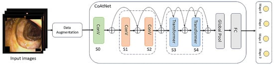 CoAtNet provides four structural variants, defined by the number of blocks at each stage, assuming an input resolution of 224 × 224. In this study, we utilized the CoAtNet_2 architecture, which consisted of block configurations of (2, 2, 6, 14, 2) and corresponding hidden dimensions of (192, 192, 256, 512, 1014) across Stages S0 to S4, respectively. A kernel size of 3 was uniformly employed for all convolutional (Conv) and mobile inverted bottleneck convolutional (MBConv) blocks. The detailed parameter settings for other CoAtNet variants are available in the original publication [6].