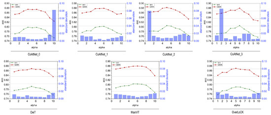 Since the selection of the parameter in the CDW-CE loss function significantly affects model performance across different architectures, this study systematically investigated its impact. To determine the optimal values for various models, we plotted the test curves of CoAtNet (Levels 0 to 3), DeiT, MaxViT, and OverLock architectures—with the latter three being base-level models—across a range of values (from 1 to 10), as shown in Figure 2, which presents the corresponding accuracy, quadratic weighted kappa (QWK), and standard deviation values. All subsequent comparative experiments were conducted using the best-performing values identified for each model based on this analysis. According to the experimental results, the optimal values for CoAtNet_0, CoAtNet_1, CoAtNet_2, CoAtNet_3, DeiT, MaxViT, and OverLock were 6.0, 6.0, 5.0, 6.0, 5.0, 6.0, and 5.0, respectively.