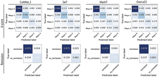 Based on the confusion matrix results, it is evident that all models achieved the highest classification performance on Mayo 0, followed by Mayo 3 or Mayo 1, while Mayo 2 was associated with the worst scores. This trend may be attributed to the imbalanced data distribution. Comparative analysis also shows that our models exhibited better classification ability on class Mayo 3 compared to traditional CNN models, and the CoaTNet model improved classification performance across all categories compared to all the other models, rather than being optimized for a specific class.
