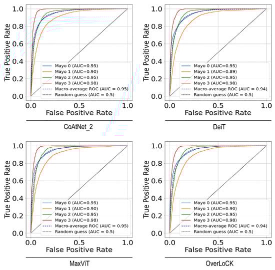 Moreover, we conducted ROC and AUC analyses to provide a more intuitive comparison of the classification capabilities of different models across each category from a new viewpoint. As shown in Figure 4, the performance of each model in the four-score plus remission classification task is illustrated using ROCs based on the one-vs-rest strategy for each class. The corresponding macro-averaged AUC values were also calculated. These observations imply that both the individual class AUCs and the macro-average AUCs were close to or exceeded , demonstrating the models’ strong and consistent classification performance across all categories. In terms of the remission classification, the AUC results were 0.99, which revealed high classification performance. An interesting phenomenon is that the Mayo 3 category, despite having the lowest classification accuracy, achieved the highest AUC score. This is because AUC and accuracy evaluate model performance from different perspectives. AUC measures the model’s overall discriminative ability and is threshold-independent, whereas accuracy reflects the model’s correctness at a specific decision threshold. The high AUC for the Mayo 3 category indicates that the model generally assigns higher prediction probabilities to Mayo 3 samples compared to non-Mayo 3 samples. However, its low accuracy suggests that Mayo 3 is inherently more challenging to classify than other categories.
