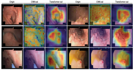 Finally, to interpret the decision-making process of the model, we employed Gradient-Weighted Class Activation Mapping (Grad-CAM) to visualize the output feature maps at different stages of the network. This includes the feature maps from the last convolutional layers in the convolutional modules (Stage 1–2), as well as the output of the final normalization layers in the last transformer modules (Stage 3–4), which reflect the attention-enhanced feature representations. These visualizations effectively highlight the regions of interest attended to by the model. The detailed visualization and workflow are presented in Figure 5.
