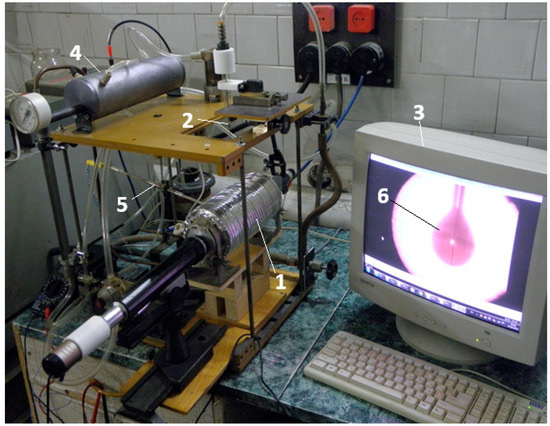 Droplet combustion stand: 1—furnace, 2—thermocouple head assembly equipped with transmitter, 3—integrated computer imaging system, 4—compressed air unit, 5—temperature monitoring unit, 6—suspended droplet.