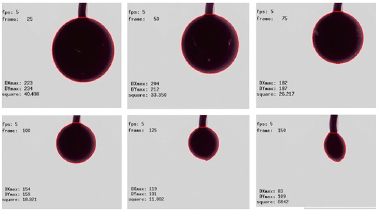 As documented in Ref. [40], during the ignition delay phase, diesel fuel is subjected to an in-cylinder temperature ranging from 960 to 1000 K. The upper limit of this interval for biofuel may reach 1017 K. During the period of physical ignition delay at the aforementioned in-cylinder temperature values, the fuel is atomized to form smaller droplets, then vaporized and mixed with the atmospheric air [40]. For carrying out an experiment, droplets with 2.2 mm diameter of pure and blended fuels were used. The alteration of a droplet radius over time was monitored using the integrated computer imaging system (see Figure 2). Depending on the surface tension characteristics of the tested fuel and the unique in-cylinder temperature range of the diesel engine, the most suitable temperature range for diesel fuel and RME drops was 930–1100 K. The surrounding conditions used in the laboratory during droplet combustion experiments were atmospheric pressure 1005 hPa, ambient temperature 20 °C and relative air humidity 47%.