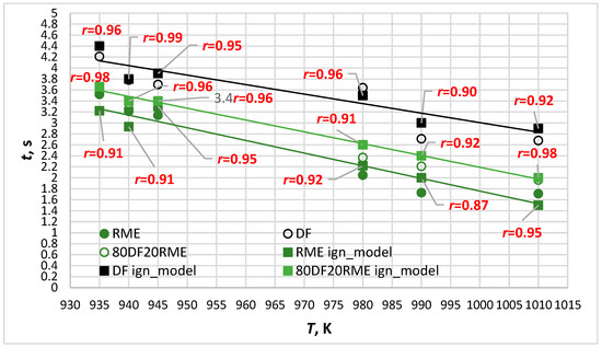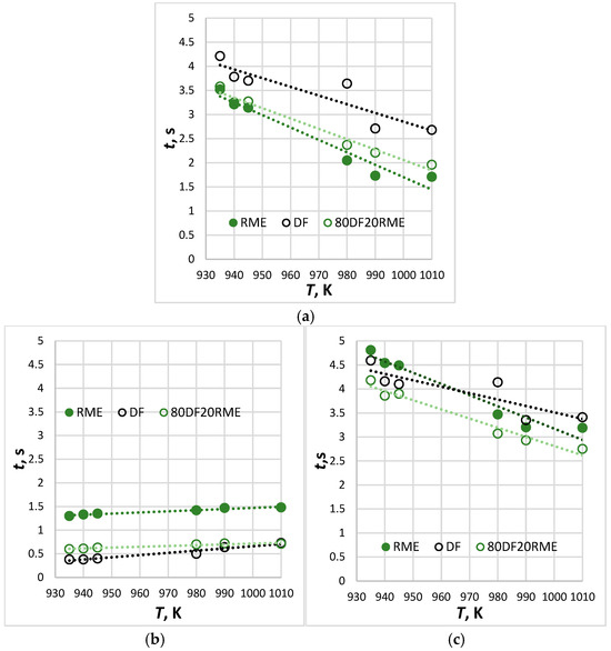 One of the main characteristics of any motor fuel, which characterizes the duration of all processes that precede ignition and then accompany combustion, is the lifetime of the droplet. This period, in turn, consists of the chemical ignition delay time of a droplet coupled with its combustion duration. The duration of the main phases of the chemical reaction kinetics for fuel droplets of d0 = 2.2 mm exposed to a high-temperature environment is presented in Figure 3. It is seen that diesel evaporation has the longest ignition delay times (Figure 3a). As biodiesel is used, not only a 16.4% shorter ignition delay was registered at T = 935 K, but at the highest temperature ranges the reduction becomes drastic. The same tendency is distinctive to the 80DF20RME blend. This abrupt event indicates the transition from more volatile diesel-dominated evaporating to one involving less volatile biodiesel. This is the most nonlinear phase of the chemical kinetics reaction. This is because intense flame heating drives the droplet surface temperature close to the boiling point of the surface components, at which the volatility of the fuel loses its sensitivity to the vapor concentration of the fuel at the surface and thereby the gasification rate of the fuel [34].