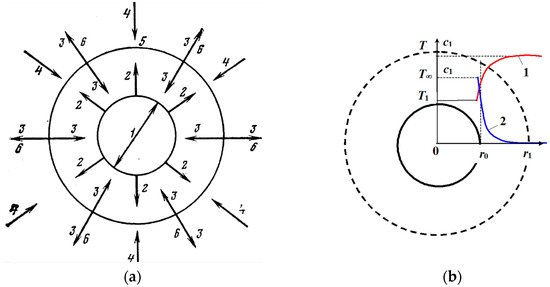 Hydrocarbon fuel droplet. (a) Diagram of all phenomena involved in the evaporation and combustion processes: 1—surface of a droplet; 2—vapor; 3—heat; 4—oxygen; 5—chemical reaction zone; 6—products formed from chemical reaction. (b) Diagram of relationships between process parameters: 1—temperature distribution in space T(r); 2—distribution of vapor concentration around droplet c1(r). The dotted line indicates the zone where the chemical reaction starts (separating fuel vapor from the oxidizer).
