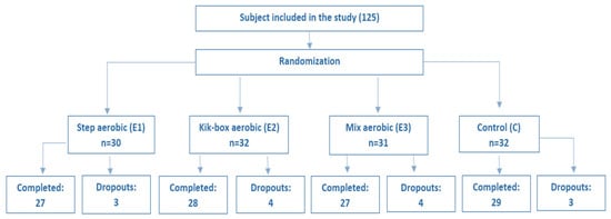 Out of 125 participants who were initially randomized, 111 completed the intervention and participated in both baseline and post-intervention assessments. The final distribution of participants was as follows: mix aerobic (E1, n = 27), kickbox aerobic (E2, n = 28), step aerobic (E3, n = 27), and control (C, n = 29). A total of 14 participants did not complete the study: nine were excluded due to low attendance (defined as participation in less than 75% of the scheduled sessions), and five withdrew voluntarily, citing minor illness or scheduling conflicts (Figure 1). These dropouts were evenly distributed across the groups and did not affect the randomization balance. No adverse events related to the interventions were reported.