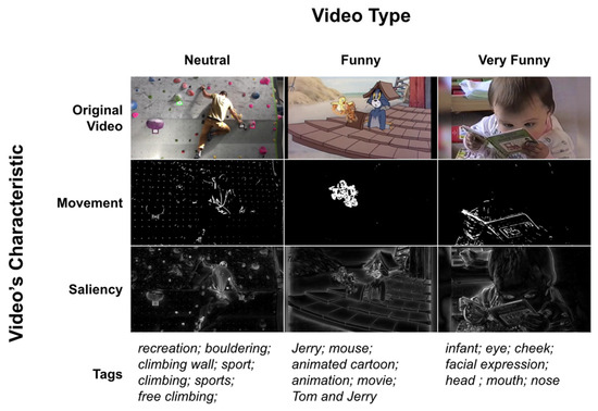 To obtain a more comprehensive understanding of amusement, we investigated the influence of visual properties and semantic content on amusement intensity (Figure 1). We extracted visual properties frame-by-frame to capture the dynamic elements of the video and the visual cues that contribute the most to amusement. To accomplish this, we measured each frame’s movement because humor often involves unexpected or exaggerated movements such as falls or slips. Additionally, we measured frame saliency to highlight the most important parts of the video that are likely to capture the viewer’s attention. Furthermore, previous studies have linked these parameters to movie genres such as action, romance, and horror [47], and they can be utilized to some degree to modulate the level of funniness of a 2D scene [45,48]. Secondly, we were interested in analyzing the topics and themes present in the videos to gain insights into what types of videos are more likely to elicit amusement. We generated labels or tags automatically using a pre-trained algorithm (Video Intelligence) from Google (https://cloud.google.com/video-intelligence, e.g., accessed on 2 June 2020), and then measured the similarity of content between videos using the semantic distance score and the normalized Google distance score. These measures provide information on the relatedness between the content of the video and other related concepts or topics, which can be useful in identifying what types of videos are more likely to be funny.
