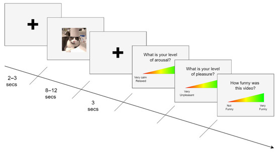 The experimental task was created using PsychoPy 3 [57] and consisted of 3 blocks of 50 trials. The order of the videos was pseudo-randomized such that there were never more than three videos of the same type in a row. Each trial consisted of a fixation cross (2–3 s), followed by a video (8–12 s), another fixation cross (3 s), and then the evaluation of the videos (free paced) (Figure 2). Participants were asked to rate each video in the following order: “What is your level of arousal, i.e., the state of excitement this video provoked in you?” (1 = very calm/relaxed and 100 = very excited/stimulated), “What is your level of pleasure, i.e., the pleasantness level evoked by the video?” (1 = very unpleasant and 100 = very pleasant), and “How funny was the video?” (1 = not funny, and 100 = very funny). Participants rated the videos using non-graded scales. Throughout the experiment, participants’ facial expressions were continuously tracked using a webcam (5.0 MP front-facing camera with 1080 p).