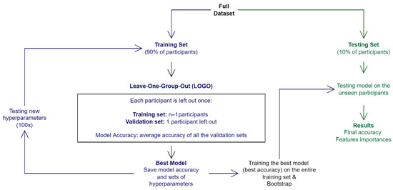 Visual representation of our machine learning pipeline. Separation of our dataset into a training set and a testing set; one participant can either be in the training or the validation sets. Leave-one-group-out technique was used to tune the hyperparameters of the model. The best model was trained on all the training sets and tested on the testing set. Accuracy and feature contributions are based on the testing set. All the procedure described in this figure was repeated 10 times.