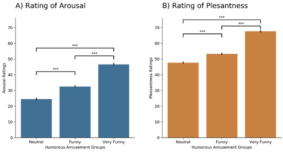 Ratings of arousal and pleasantness based on the level of amusement. Groups of humorous amusement were based on individuals’ ratings of funniness. (A) The funnier the videos were, the more participants rated them as highly arousing (blue). (B) The funnier the videos were, the more participants rated them as highly pleasant (orange). Significative t-test are shown as: ***, p < 0.001.