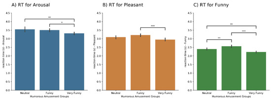 Reaction time to rate each video. Groups of humorous amusement were based on individuals’ ratings of funniness. (A) Mean reaction times per participant to rate arousal (blue), (B) mean reaction times per participant to rate pleasant (orange) and (C) mean reaction times per participant to rate funny (green). Significative t-test are shown as: *** for p < 0.001, ** for p < 0.01 and * for p < 0.05.