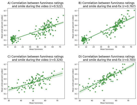 To address these challenges, we aimed to develop an objective measure of amusement intensity induced by humorous video clips based on nonverbal emotional expressions and video features. Specifically, the Facial Action Coding System (FACS) has been commonly used to infer positive emotions from nonverbal behavior [24,25]. The FACS involves transforming facial expressions into Action Units (AU), usually corresponding to a specific facial muscle, and separately rating them on a quantitative scale. The FACS has been proved useful to assess the latent physical traits of moods [26,27] and distinguish between genuine Duchenne smiles, which involve movement of the orbicularis oculi muscle around the eye (AU6) and zygomatic major muscle at the corners of the mouth (AU12), and non-genuine smiles only involving AU12 [28,29,30,31]. However, there is a controversy surrounding Duchenne smiles that could be feigned and wrongly detected when simply looking for eye constriction (AU6) [32,33,34]. This research suggests that more fine-grained methods may be necessary to accurately measure the dynamic and complex nature of humor perception.