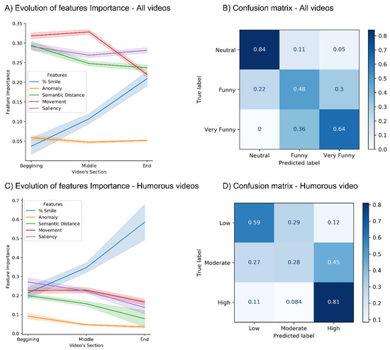 We also explored how videos’ content and characteristics could influence humorous amusement. We found that the movement and the saliency of video content, known to reflect movies’ genre (ex: action, romance, horror) [47], and videos’ semantic content, previously used to modulate to some extent the level of funniness of a 2D scene [48], were able to distinguish neutral vs. funny vs. very funny videos efficiently (DA up to 64%). However, the confusion matrix (Figure 7D) showed a model that uses video features to accurately differentiates between neutral and all humorous videos but not the intensity of amusement (funny vs. very funny). Finding significant differences between neutral and humorous videos’ characteristics is consistent with numerous studies decoding emotions based on pictures or videos geometry [42,43], art-features and semantic annotations [44,45,46]. The contribution of video features to DA scores remains constant over time, which is contrary to the dynamic nature of the amusement process that we seek to quantify in this study. Moreover, when only considering humorous videos, videos’ properties did not contribute to predictions, and DAs dropped to 41–45%, supporting the idea that they are mainly relevant to classify neutral and humorous videos only. In sum, visual and semantic properties of neutral and funny videos in our experiment were quite different and led to high DAs, but these features did not differ between humorous videos and therefore cannot explain the other DA results reported in this article.