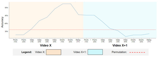 In order to better characterize how the intensity of the humorous amusement experienced by the participants evolved in time, we assessed the decoding of neutral, funny and very funny videos using the % Smile feature over successive trials, including resting and inter-trial periods. In brief, this analysis consists in testing the temporal window during which % Smile can significantly predict the intensity of the amusement perceived by the participants and thus to highlight the duration during which the amusement was maintained after the viewing of a video. Decoding accuracy obtained at each moment in time over two consecutive trials is shown in Figure 8. We used the highest permutation score across all time points (DA = 35.9%) as the threshold to consider a DA significant. The DA was at chance level during resting periods preceding the video (prefix-1: DA = 32.6%, prefix-2: DA = 32.6%), and became significant a few seconds after the start of the video (video 1/4: DA = 36.3%). The DA stayed significant until the middle of the next video in the successive trial (>20 s apart): it gradually increased during the viewing of the video (video 2/4: DA = 41.6%, video 3/4: DA = 43.9%, video 4/4: DA = 49.3%) until it reached its peak during the time period right after the video (end-fix-1: DA = 52.5%, end-fix-2: DA = 52.5%). The DA started to drop when the participant was rating the video (DA = 45.5%). The DA decreased slowly (prefix-1: DA = 45.2%, prefix-2: DA = 45.2%, video-1/4: DA = 41.2%, video-2/4: DA = 36.7%) until it reached the chance level in the middle (video 3/4: DA = 35.3%) of the second video and stayed under the chance level for the rest of the trial (video 4/4: DA = 31.5%, enfix-1: DA = 32.5%, endfix-2: DA = 32.5%, ratings: DA = 33.3%). These results confirmed that smiles are stronger predictors of amusement levels toward the end of the video, and this discriminative power persists over time even after the end of the video and beginning of the following one. This is coherent with our observation that the level of amusement for funny videos is generally stronger toward the end of the videos, and a lingering smile even after the end of the video reflects the persistence of the amusement. In addition, this lasting impact potentially explains the potentiating effect of amusement we demonstrated behaviorally: a video will be more easily evaluated as funny if the previous one was also funny (see Section 3.1.1).