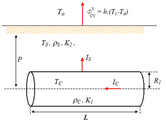 Schematic of a buried cylindrical conductor with electric and thermal interactions.