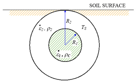 This is equivalent to assuming that, at short times, both configurations are equivalent. Figure 2 aims to represent this simplification of the problem by showing a cross-sectional view of the conductor (shaded circle), surrounded by a cylindrical layer of soil with radius R2. The Joule power densities and generated in the conductor and the soil by the currents Ic and Is, respectively, are also shown. With these considerations, the equations to be solved are