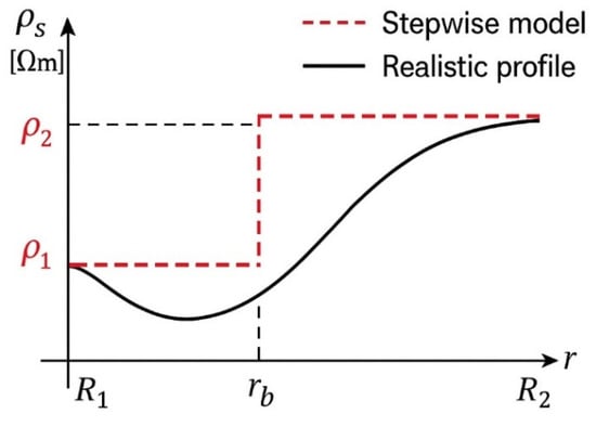 Some final comments on the impact of the variation of soil resistivity with temperature are provided below. Since the temperature increase in the soil leads to a decrease in its electrical resistivity around the conductor, this may cause a reduction in its electric potential. The effect would be similar to surrounding the conductor with a layer of soil made of a material with a lower resistivity than the rest of the soil. It can also be thought of as equivalent to increasing the radius of the conductor, as happens in ionization phenomena due to high leakage currents. The magnitude of this increase can be estimated in several ways. In this paper, the decrease in the resistivity of the soil near the conductor is considered through the following reasoning. Since soil resistivity as a function of the radial distance r from the original radius of the conductor R1 to the boundary R2 is available, the theoretical resistance RG of a cylindrical layer [22] with radii R1 and R2 can be approximately calculated by . This resistance is equated to that calculated for a cylindrical layer composed of two juxtaposed layers with constant resistivities ρ1 (close to the conductor resistivity) surrounding the conductor with radii R1 and rb, and a second layer with resistivity ρ2, equal to that of the original soil, with radii rb and R2, as it is shown in Figure 3.
