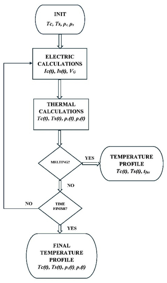 Given that determining the currents Ic and Is from the material resistivities in the system involves a slow calculation, whereas solving (9) requires a time loop with several thousand steps, an approximation is proposed. In Code (9) to calculate the final temperature, the time interval will be divided into a few temporal segments or intervals, in each of which the currents Ic(t) and Is(t) are considered constant. At the end of each interval, a temperature will be obtained, which will be used to recalculate the values of these currents, which will influence the intensity of the sources. These new source values will be used in the next interval, and the cycle will repeat until the final time is reached.
