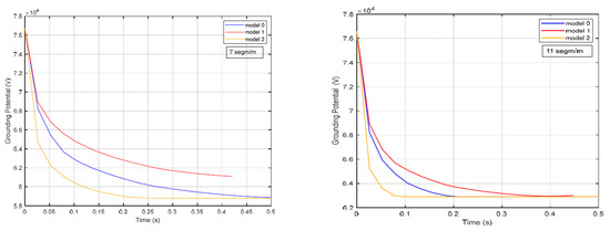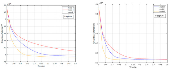 For the purpose of comparing results, two different segmentations of the rods have been considered: 7 segments per meter and 11 segments per meter of conductor. The potential acquired by the electrode corresponds to the potential at the fault current injection point. The time evolution of the electrode potential under various scenarios is shown in Figure 6.
