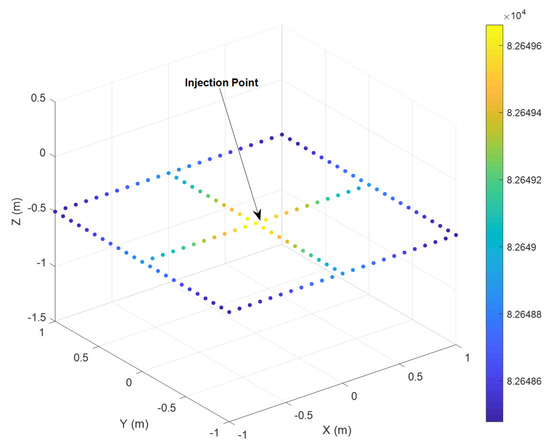 The electrode consists of a basic horizontal grid composed of bare copper rods with a radius of 5 mm, buried at a depth of 0.5 m in homogeneous soil with a resistivity of 50 Ω·m. The fault current injection point—an important consideration in real electrodes with internal resistance—is located at the geometric center of the grid, the point P(0, 0, −0.5), with a current magnitude of 10 kA. This current value was selected because it is on the same order of magnitude as that generated by lightning strikes and is capable of producing high temperatures over short time intervals. In typical fault scenarios, the currents diverted to the grounding system are usually much lower; however, they could also lead to significant temperature rises if not for the prompt action of protection devices, which limit the duration of fault current flow through the grounding electrodes.